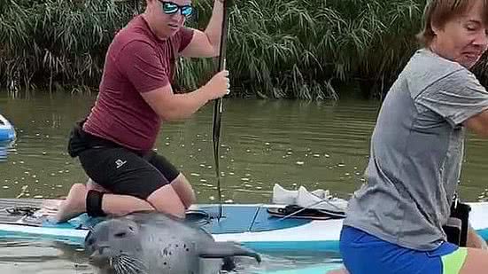Foi exatamente o que aconteceu com Daren Ford e Kerrie Rocket, em um lago de West Sussex, na Inglaterra. Elas estavam praticando paddleboards quando, do nada, uma foquinha pulou em uma das pranchas e resolveu ficar ali, de boaça!