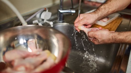 Um dos achados mais expressivos do estudo diz respeito ao hábito de "lavar" carne crua na pia, ou melhor, passar água na carne antes de cozinhá-la: 46,3% dos entrevistados afirmaram fazer isso regularmente, especialmente com frango. O problema é que a prática não limpa a carne, e sim, espalha microrganismos pelo ambiente. Os respingos de água contaminada se depositam na pia, na bancada, em utensílios próximos e até em outros alimentos, causando o que os especialistas chamam de contaminação cruzada que pode levar ao consumo de alimentos contaminados e, consequentemente, ao desenvolvimento de Doenças Transmitidas por Alimentos (DTAs).