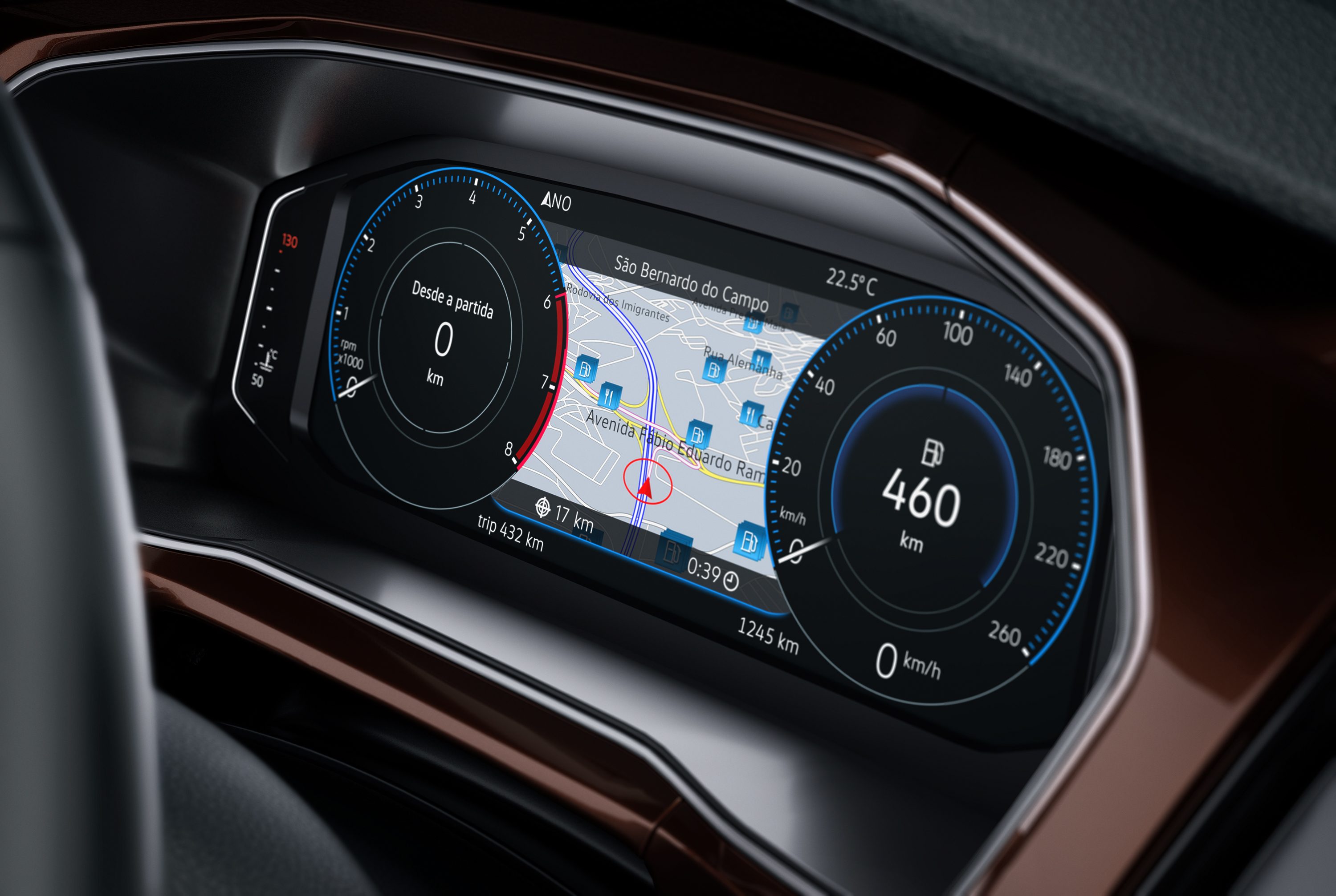 As informações sobre as funções de condução, de navegação e de assistência podem ser integradas em áreas gráficas do velocímetro e conta-giros, conforme necessário. Dados exibidos no console central pelo sistema de infotainment, também podem ser exibidas no Painel Digital Programável.