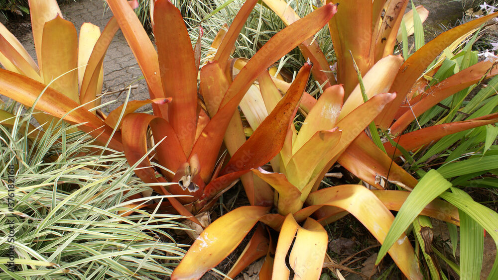 Bromélia Porto Seguro (Aechmea blanchetiana): é uma planta típica da Mata Atlântica e tem hábitos terrestres, folhas sem espinhos e pode atingir 80 cm de altura e, quando no sol apresenta tons amarelados.