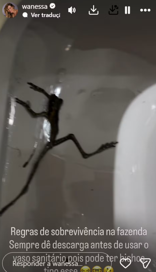 Em meio ao momento inusitado, Wanessa começou a gravar a situação. “É uma perereca ou uma cobra? (…) Gente, que bicho feio, é um ET. Minha nossa!”, brincou ela nas redes sociais ao mostrar o intruso no banheiro.
