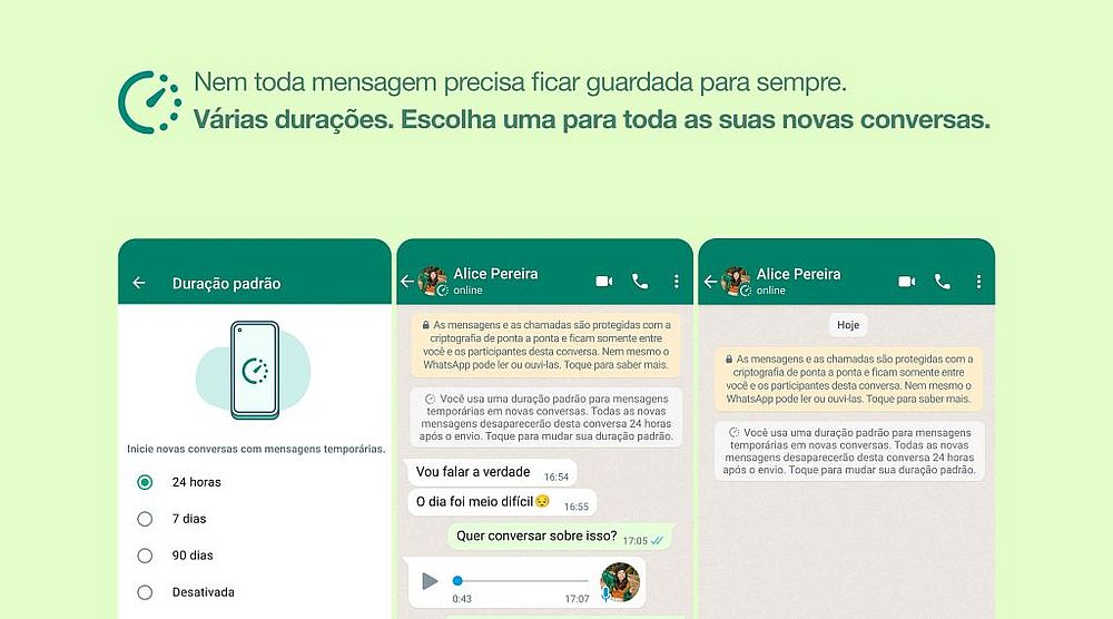 Ao configurar para que as mensagens sejam temporárias, após o tempo limite definido, as mensagens serão eliminadas para sempre, de todos os dispositivos em que o aplicativo foi utilizado, sem poderem ser recuperadas, diz a empresa.