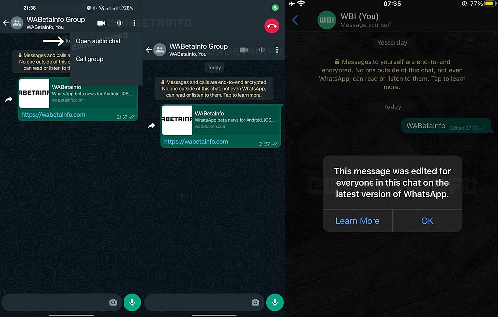 Ao que tudo indica, o WhatsApp está a todo vapor no desenvolvimento de novos recursos para o mensageiro. De acordo com informações do WABetaInfo, site especializado no app, a plataforma está agora testando na versão beta para iOS a esperada edição de mensagens e também, esse na versão Android, um chat de áudio para grupos.