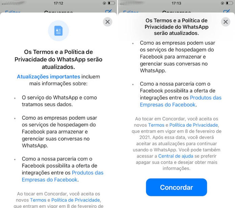 O WhatsApp passou a emitir, nesta semana, uma mensagem sobre a atualização da política de privacidade do app para informar que, a partir de então, o mensageiro compartilhará os dados e as conversas com as empresas parceiras do Facebook. As mudanças entram em vigor a partir de 8 de fevereiro, e quem quiser continuar utilizando o serviço de chat será obrigado a aceitar as novas condições.