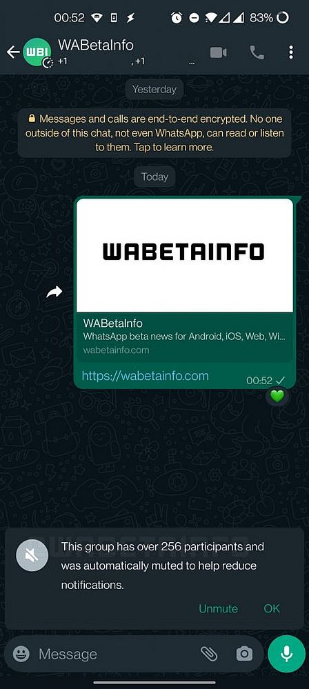 Como pode ser visto na captura de tela acima, feita pelo WABetaInfo, há uma mensagem que informa ao usuário recém-ingresso no grupo as notificações foram silenciadas automaticamente pelo fato de o grupo possuir mais de 256 participantes.