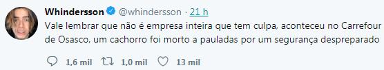 Em sua conta no Twitter, Whindersson quis chamar a atenção para o crime, mas acabou recebendo diversas críticas.