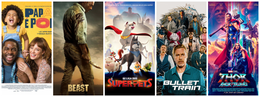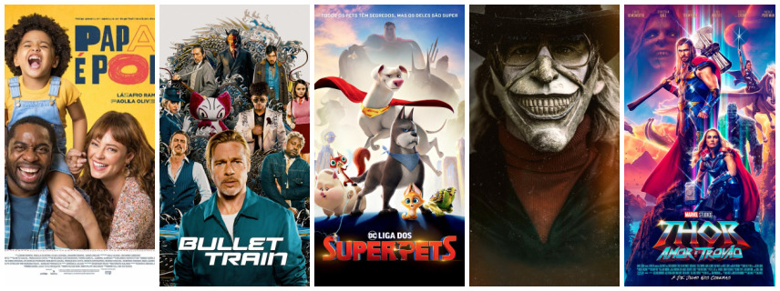 Na parte alta da cidade, ‘Papai é Pop’, ‘A Fera’ e ‘Gêmeo Maligno’ chegam com destaque. Ainda em exibição ‘Trem-Bala’, ‘O Palestrante’, ‘DC Liga dos Super-Pets’, ‘Telefone Preto’, ‘Thor: Amor e Trovão’, ‘Minions 2: A Origem de Gru’ e ‘Top Gun: Maverick’.