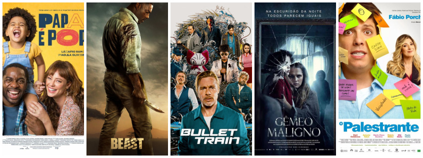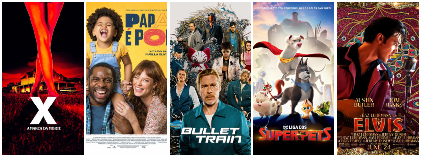 A rede Kinoplex traz a estreia de ‘X - A Marca da Morte’, ‘Papai é Pop’ e ‘A Fera’. Seguem em exibição ‘Trem Bala’, ação protagonizada por Brad Pitt e Sandra Bullock, ‘DC Liga dos Super-Pets’, nova animação da DC, ‘Elvis’, longa sobre a vida do “Rei do Rock”, ‘Telefone Preto’, ‘Thor: Amor e Trovão’ e ‘Minions 2: A Origem de Gru’.