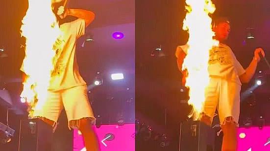 O cantor estava em Conceição do Araguaia, no Pará, e enquanto cantava, uma fã registrou o momento exato que um jato de fogo foi ativado diretamente no rosto do cantor.