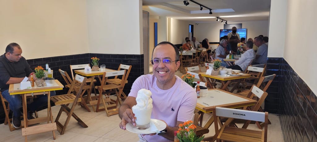 Outra grata surpresa do local é a caipirosca de limão, que mais parece uma sobremesa alcoólica, principalmente para quem gosta da bebida preparada com leite condensado. A história da caipirosca do Bar do Cação começou por aca so, com um erro do Deimys . “A gente não vendia caipirosca, mas um cliente insistiu tanto, que fiz, mas errei nas quantidades. O cliente gostou e acabou ficando no cardápio”, conta o autor da receita que virou sucesso.
