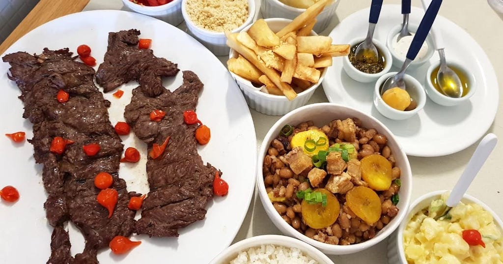 Fraldinha com feijão tropeiro, molhos, macaxeira e arroz