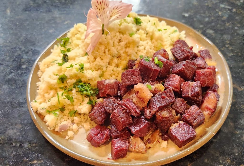 No Marjetoso, a boa comida nordestina também espaço. Charque com farofa