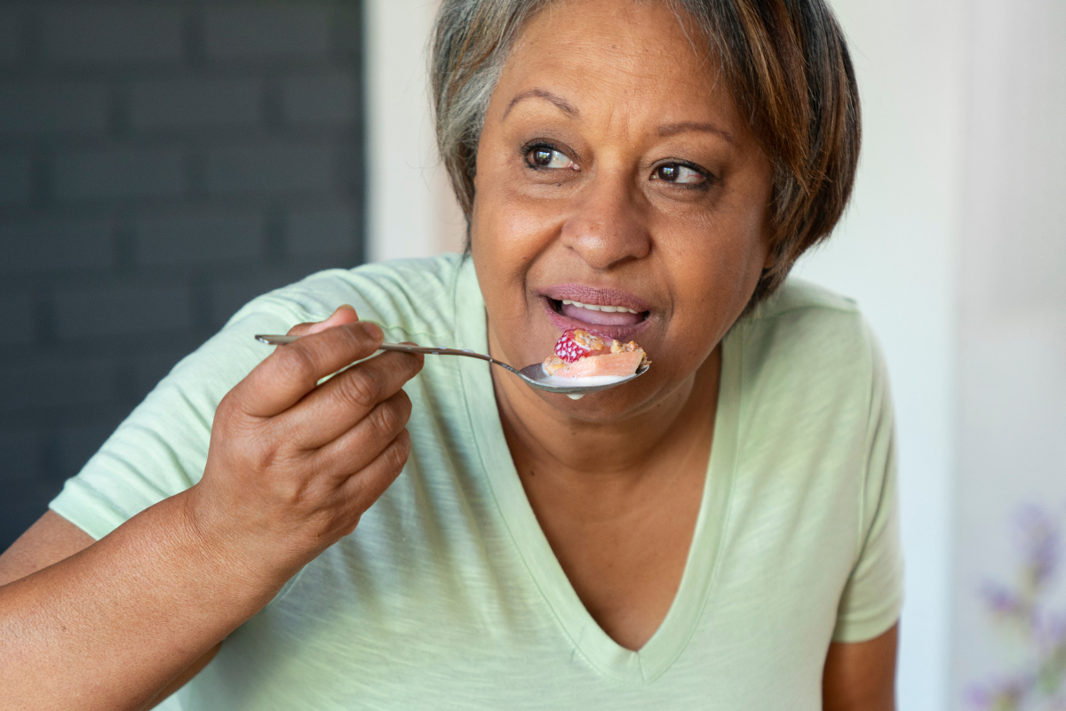 Entre os alimentos recomendados, o iogurte se destaca. Rico em proteínas de alto valor biológico, cálcio e vitaminas do complexo B, ele contribui para a manutenção muscular e a saúde óssea.