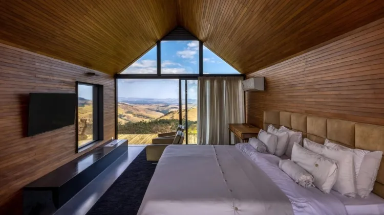 Situada na Serra Fluminense, a mansão tira proveito da beleza natural para proporcionar um ambiente tranquilo e visualmente impressionante. O projeto inclui materiais naturais, com destaque para madeira e granito, harmonizando a residência com a paisagem local.