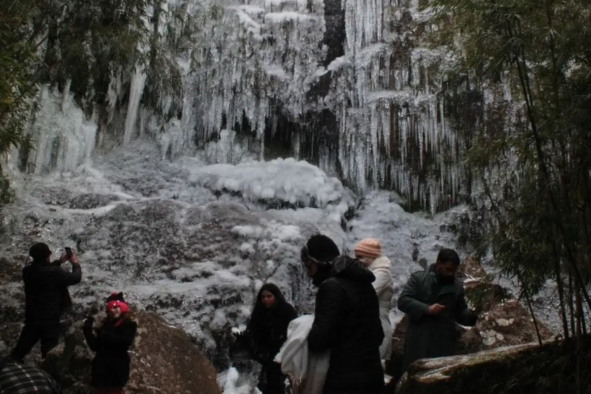 Em dias de frio extremo, uma cascata de duas quedas d’água simplesmente congela por completo — formando uma escultura natural que se ergue entre rochas, vento gelado e neblina.