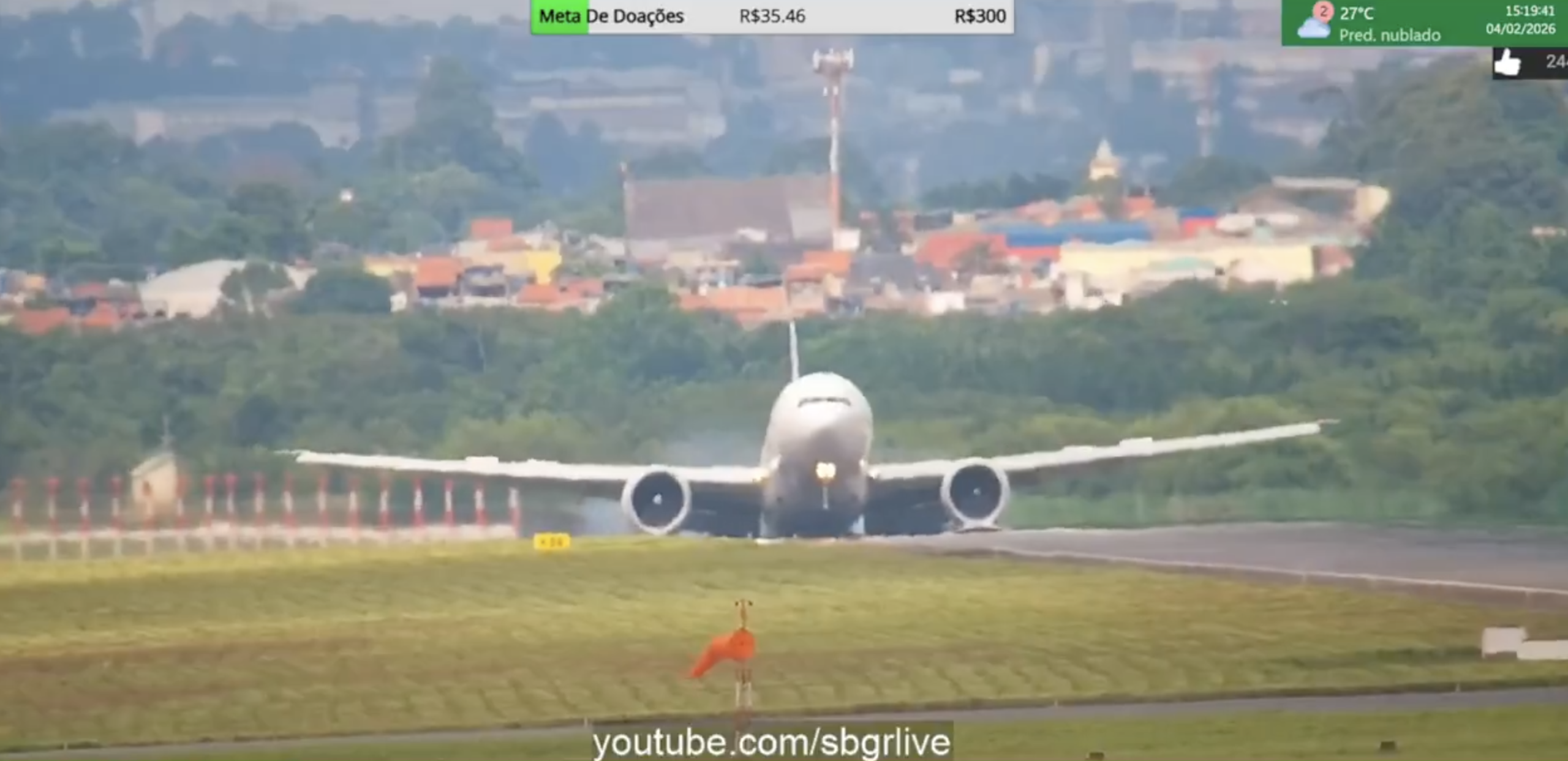 Um pouso inusitado chamou a atenção de quem acompanhava as operações no Aeroporto Internacional de Guarulhos na última quarta-feira (4). Um Boeing 777-300ER da LATAM, que operava o voo LA8147 vindo de Lisboa, realizou uma manobra pouco comum durante a aterrissagem e arrancou elogios dos controladores de tráfego aéreo, que reagiram com surpresa ao vivo.