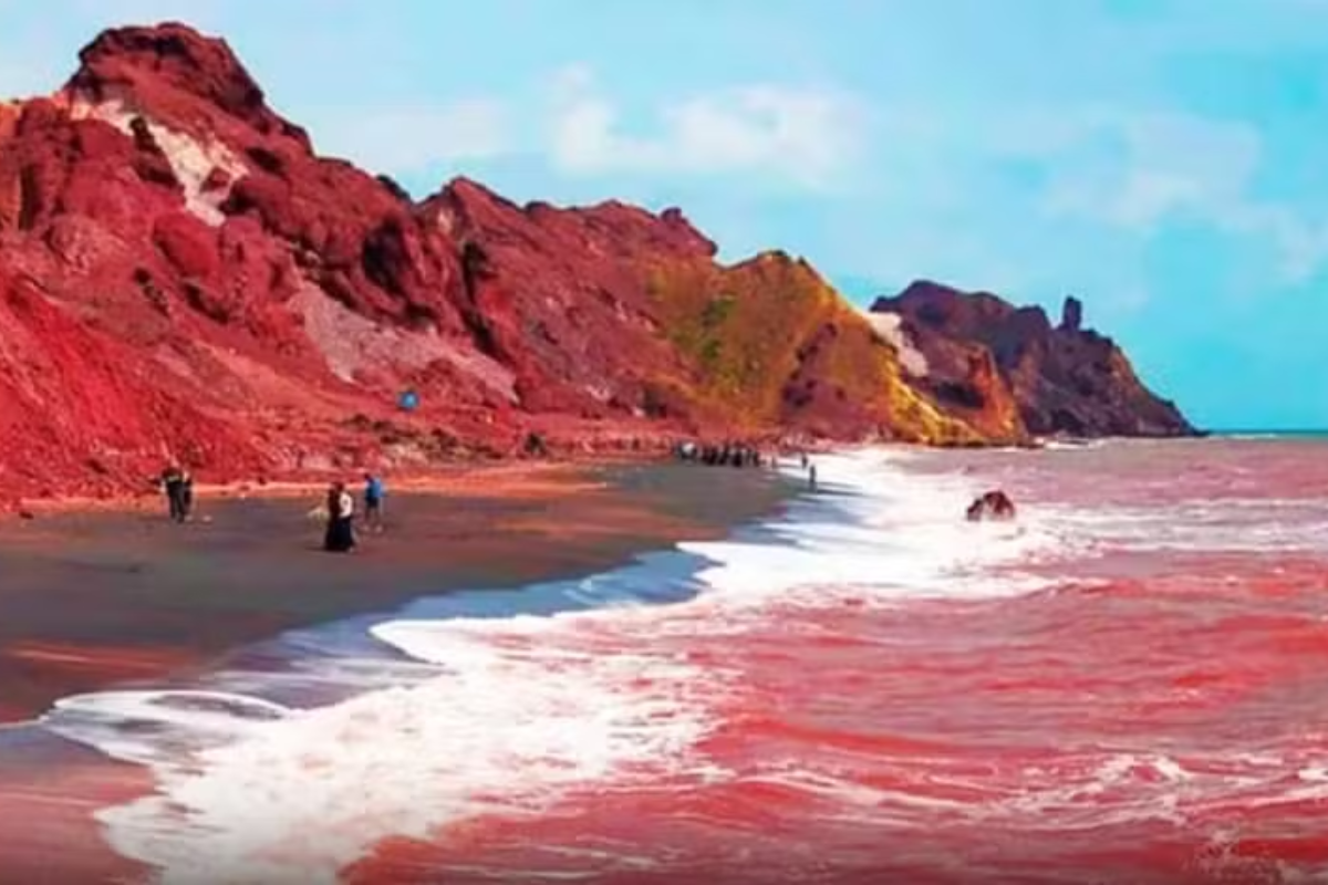 Moradores e turistas de uma ilha no litoral do Irã acordaram diante de uma cena digna de filme apocalíptico: o mar amanheceu com um tom vermelho intenso, contrastando com o céu claro e provocando espanto imediato.