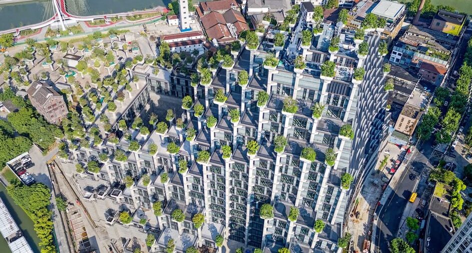 Localizado às margens do rio Suzhou Creek, ao lado do famoso distrito de arte M50, o empreendimento de nove andares foi pensado para parecer uma montanha coberta de vegetação. O nome, inclusive, faz referência direta à quantidade de árvores incorporadas no projeto.